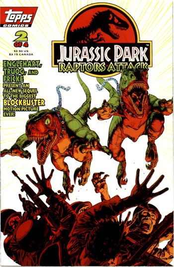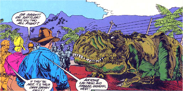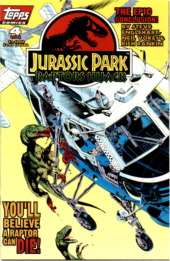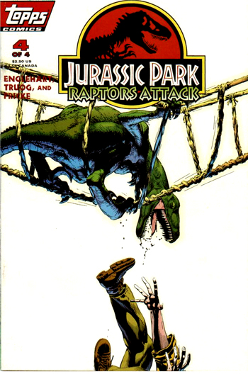#4 Après que les oeufs aient éclot, les hommes de BioSyn enferment les raptors dans un enclos nouvellement construit. Malcolm remis, lui et Ellie partent à la recherche de Grant et Muldoon et tombent sur les constructions de BioSyn. C'est le moment que choisissent les raptors pour s'échapper, massacrer leurs geoliers et disparaitre définitivement dans la jungle. Grant, Ellie, Muldoon et Malcolm sont secouru par un hélicoptère d'InGen.