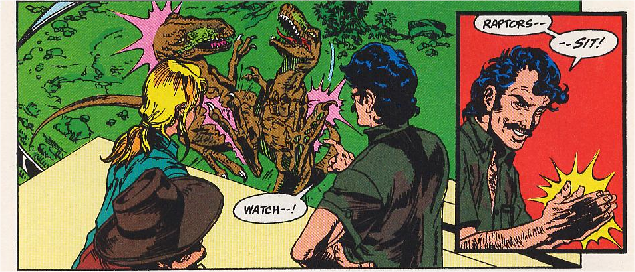 #1 Suite au crash de l'avion, Grant et Ellie se réveillent en captivité dans la jungle colombienne, retenus par un baron de la drogue qui veut dresser les raptors et les utiliser comme chiens de garde. Les deux scientifiques sont chargés de soigner les dinosaures après leurs séances d'électrochocs. Etrangement les raptors ne les attaquent pas, ils finissent par s'attacher à eux et leur donner des noms.